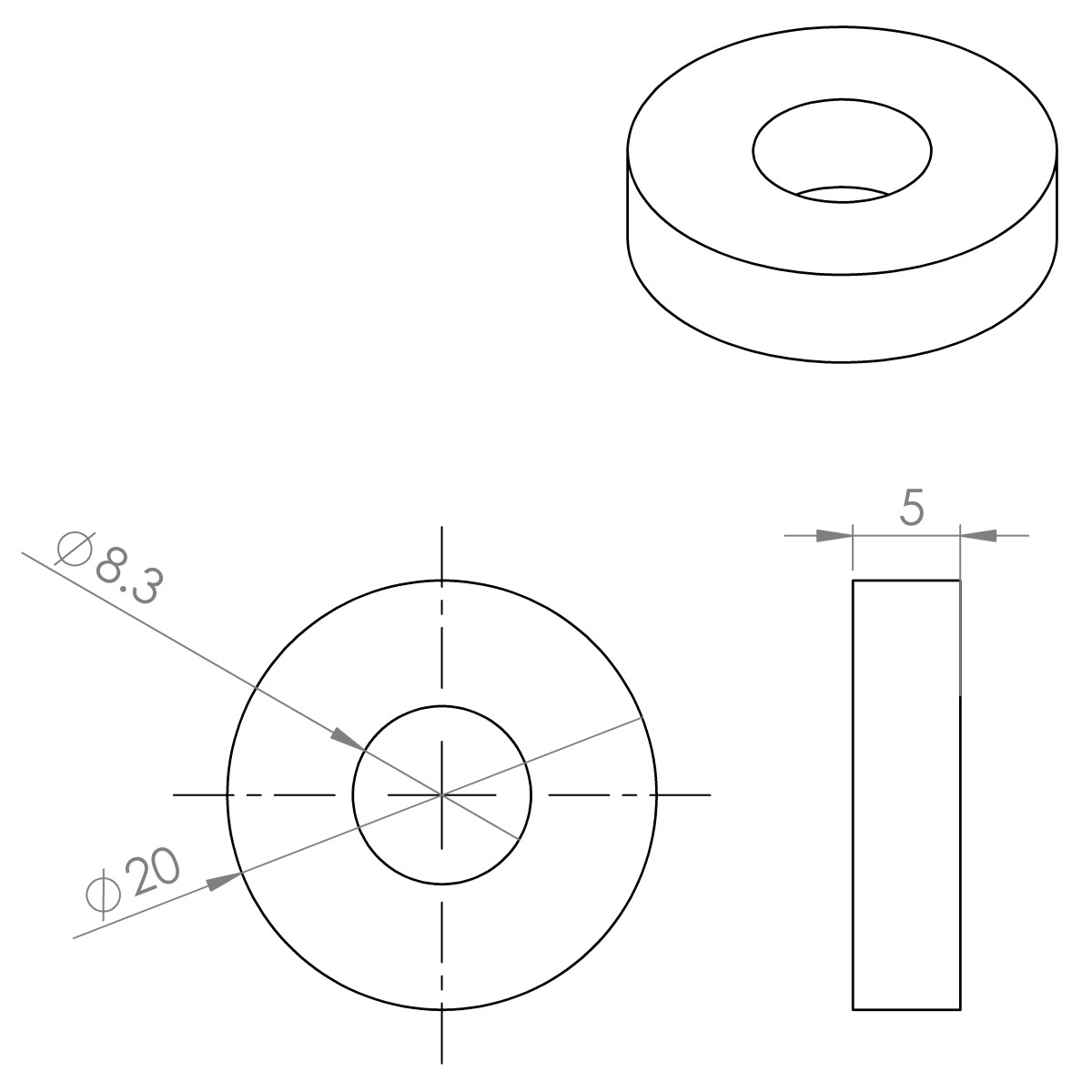 Deze afstandsbus (ook wel afstandshouder genoemd) is een compacte spacer voor montage met M8 bevestigingsmateriaal. De bus heeft een 8,3 mm centreergat (geschikt voor M8 bouten), een 20 mm buitendiameter en een dikte van 5 mm. Het materiaal is PE kunststof, waardoor de afstandsbus licht, slijtvast en praktisch is voor uiteenlopende constructies en assemblages.