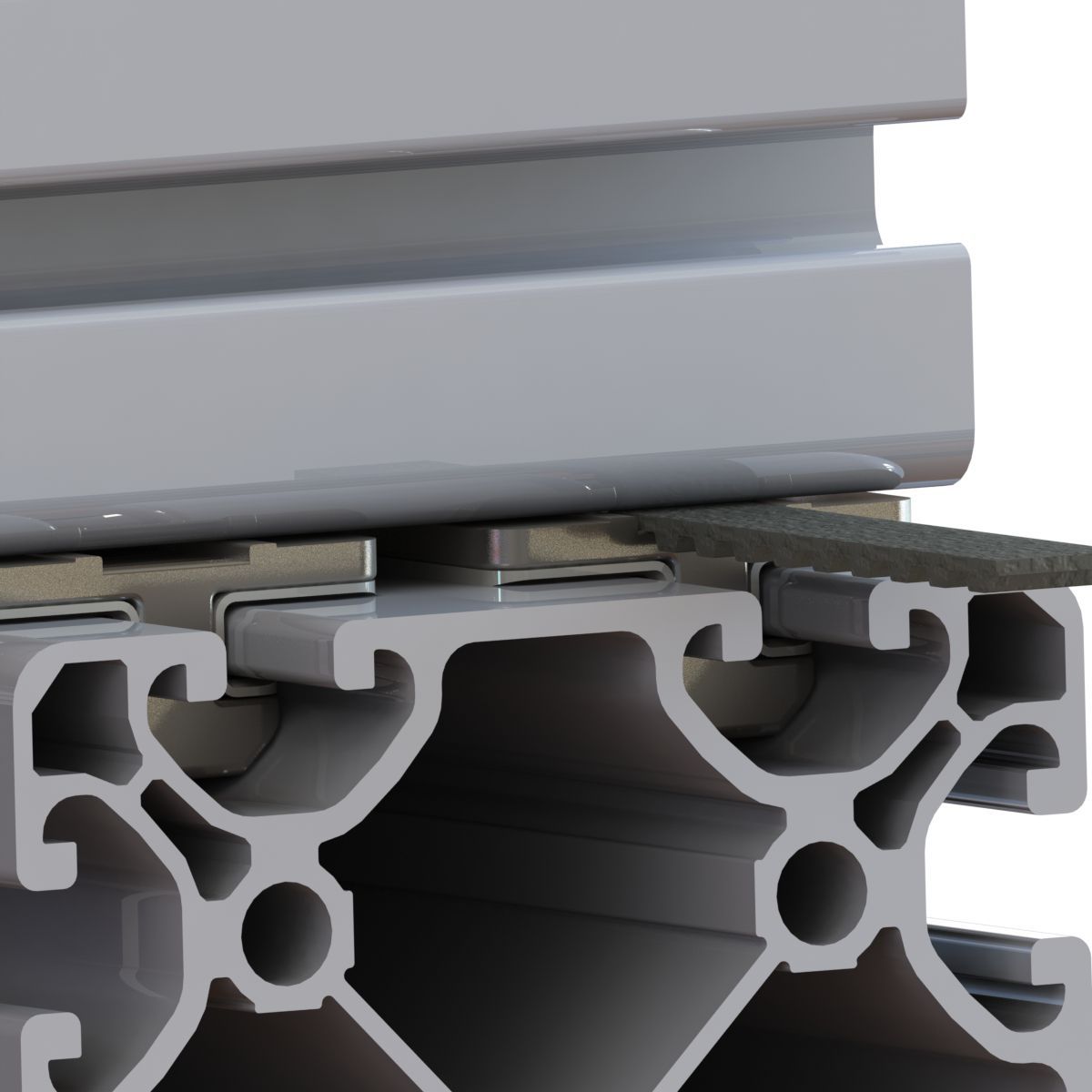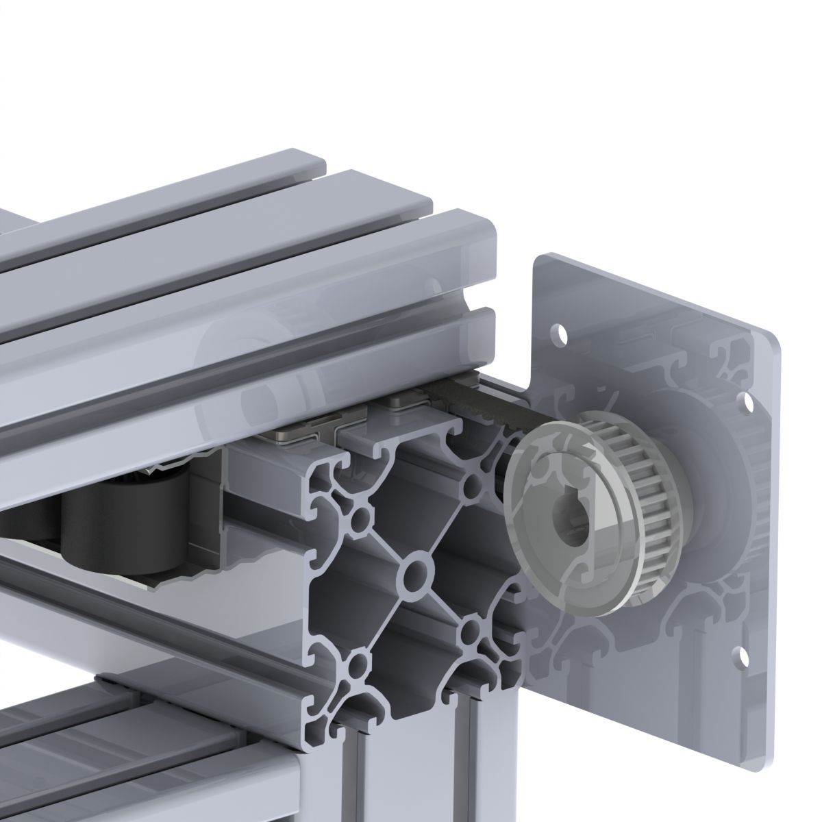 Tevens is in de slider een uitsparing aanwezig waar een T5 tandriem van maximaal 10mm breed ingeklemd kan worden, zie ook het voorbeeld. Dit maakt het heel makkelijk om 2 constructieprofielen met behulp van een tandriem en motor ten opzichte van elkaar te bewegen, zoals bijvoorbeeld het 8080 en 4080 aluminium constructieprofiel.